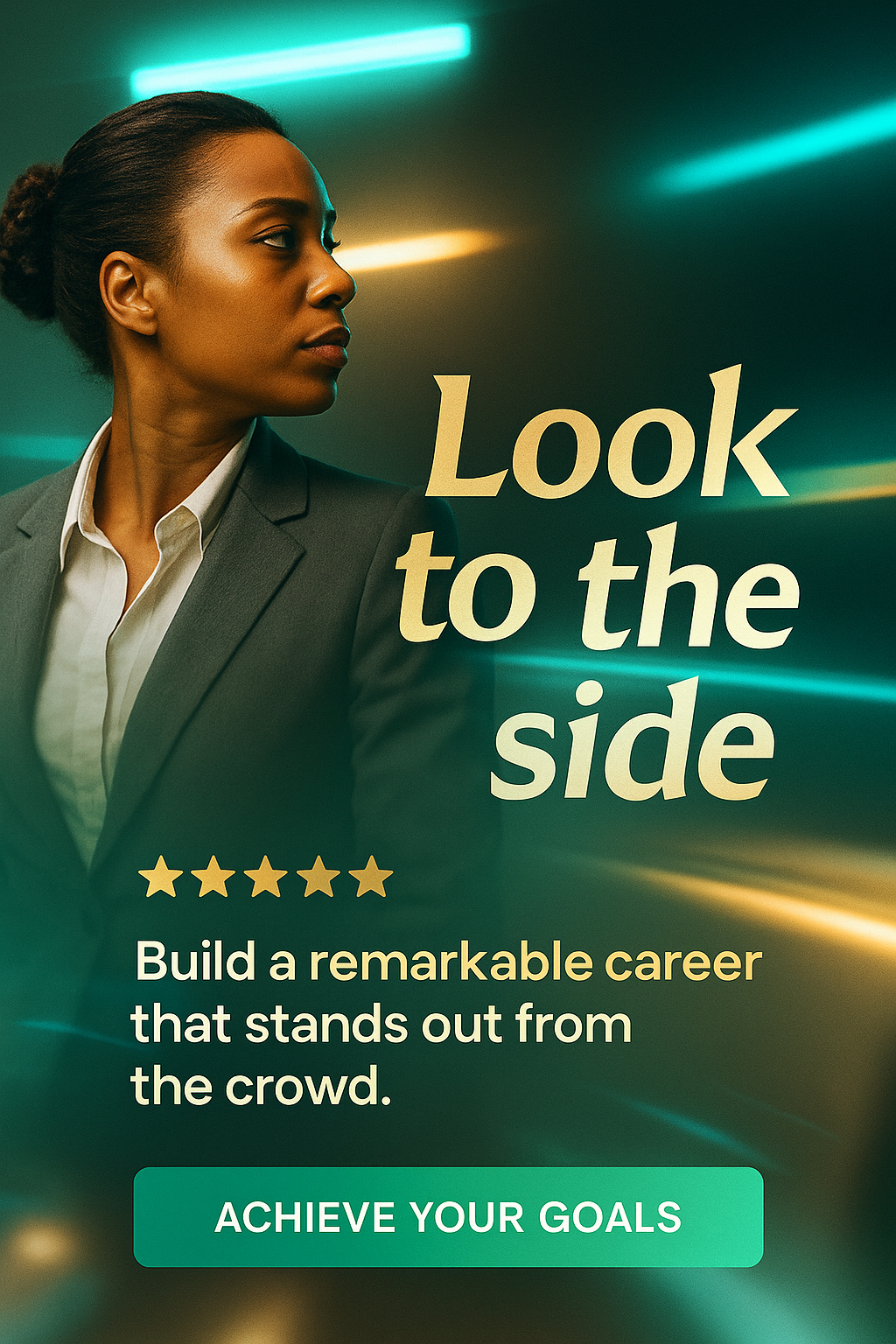 An African American businesswoman in a grey suit poses confidently, looking to the side against a vibrant, neon-lit background. The design features a harmonious blend of professional elements and engaging visuals.