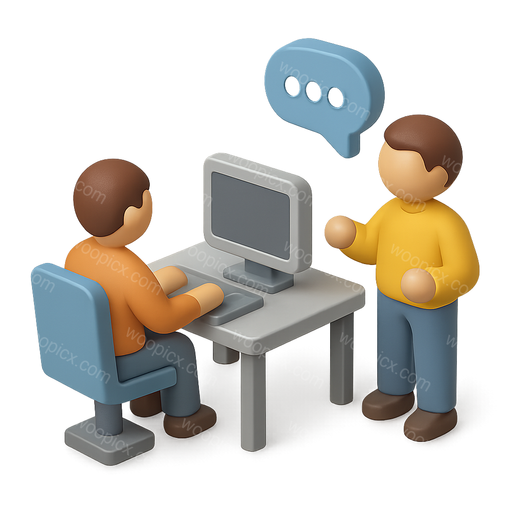 A 3D icon depicting two stylized figures engaged in conversation, one seated at a computer. The design features a transparent background with a vibrant isometric style.