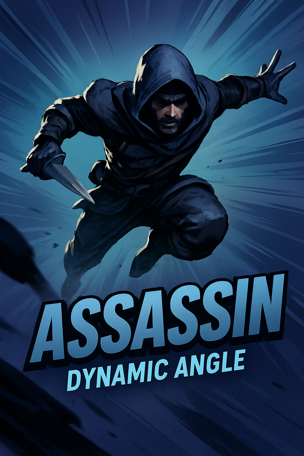 A powerful depiction of an assassin in mid-action, captured from a dynamic angle. The scene is vibrant with motion lines and a dark gradient background, emphasizing the character's movement.