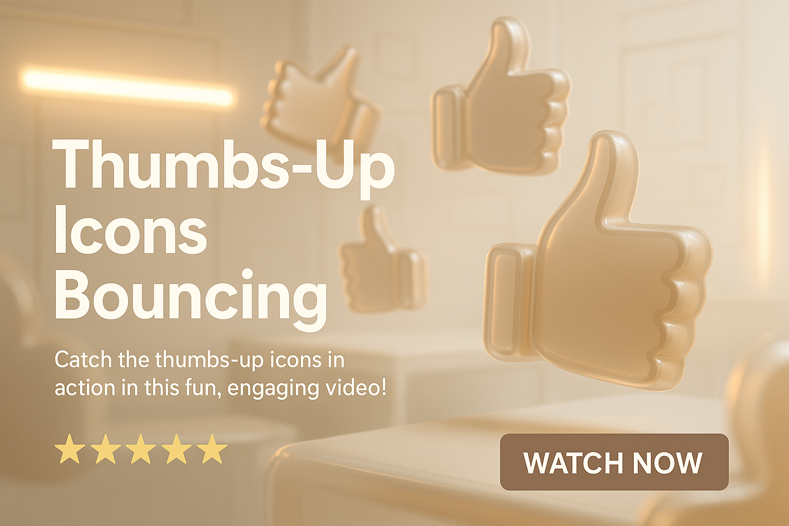 Dynamic graphic featuring 3D bouncing thumbs-up icons, ideal for promoting engaging video content. The modern design captivates viewers and enhances visual appeal.
