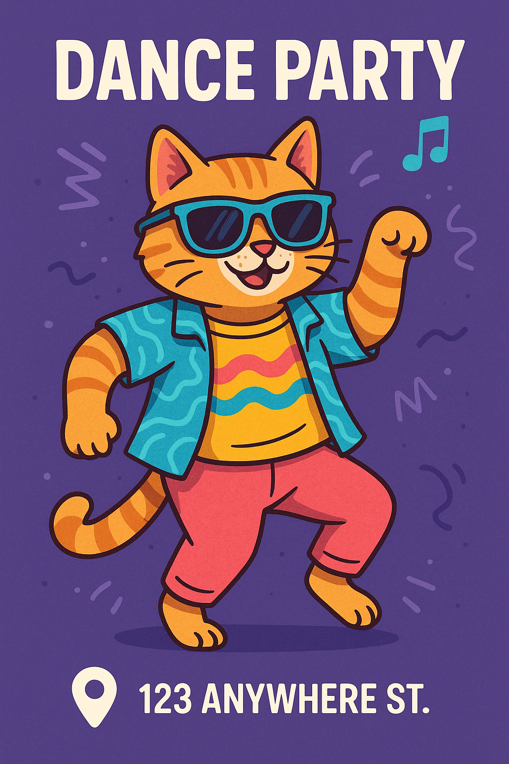 Fun and vibrant cartoon-style invitation featuring a dancing cat in sunglasses, perfect for a playful event. Ideal for children's parties or casual gatherings.