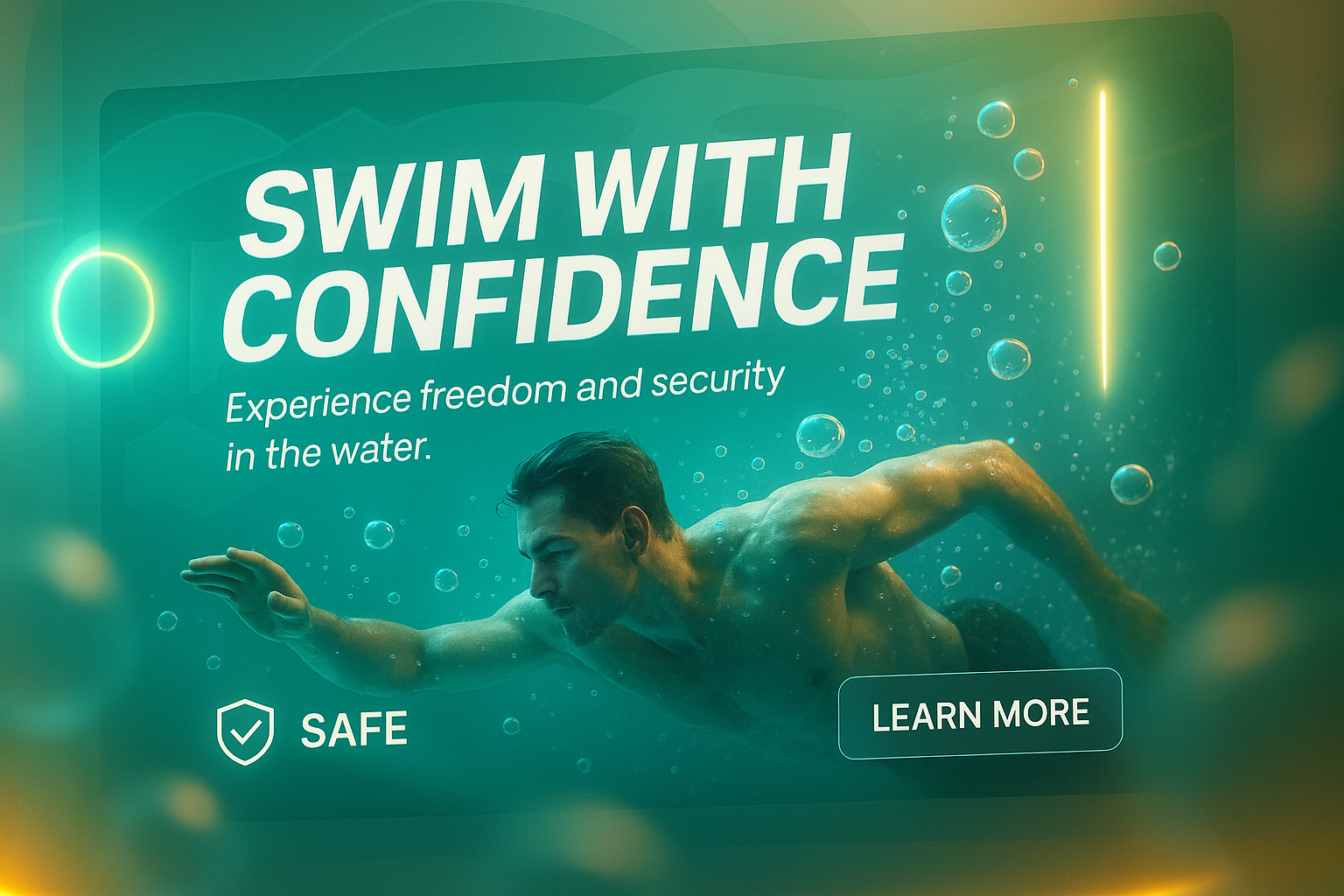 Vibrant promotional banner showcasing a swimmer underwater, emphasizing safety and confidence in aquatic activities, ideal for swim schools or safety programs.