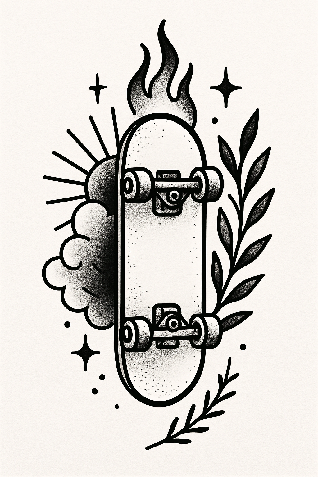A monochromatic illustration of a skateboard surrounded by flames, clouds, and leaves. Ideal for skate culture graphics or merchandise.
