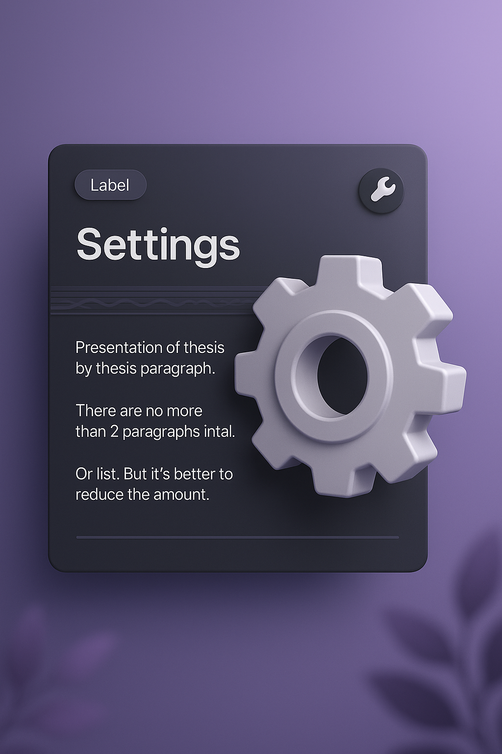 /Collection: /by davooda/Type: PNG/A sleek 3D illustration featuring a settings gear integrated into a dark-themed information block. The design includes a label, title, and descriptive text with a subtle gradient background.