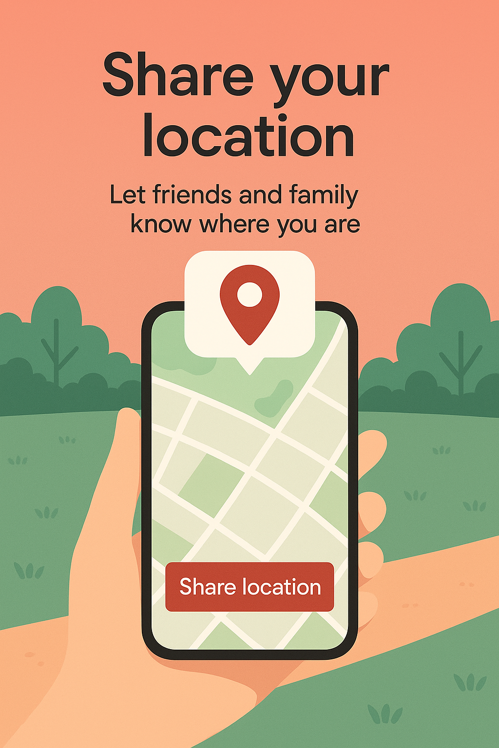 Illustrative graphic showcasing a mobile device with a map interface, encouraging users to share their location. The design is vibrant and user-friendly, aimed at app promotion.