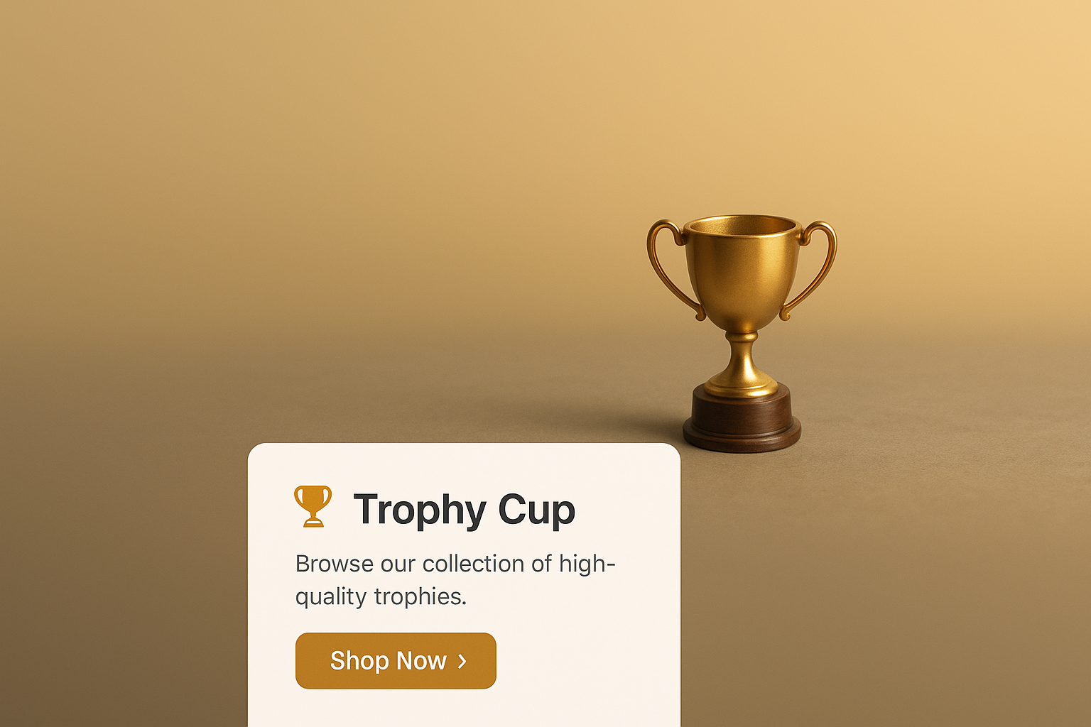 A beautifully rendered gold trophy cup positioned against a smooth gradient background. The scene captures a sense of elegance and focus on the trophy, complemented by a stylish text block and action button.