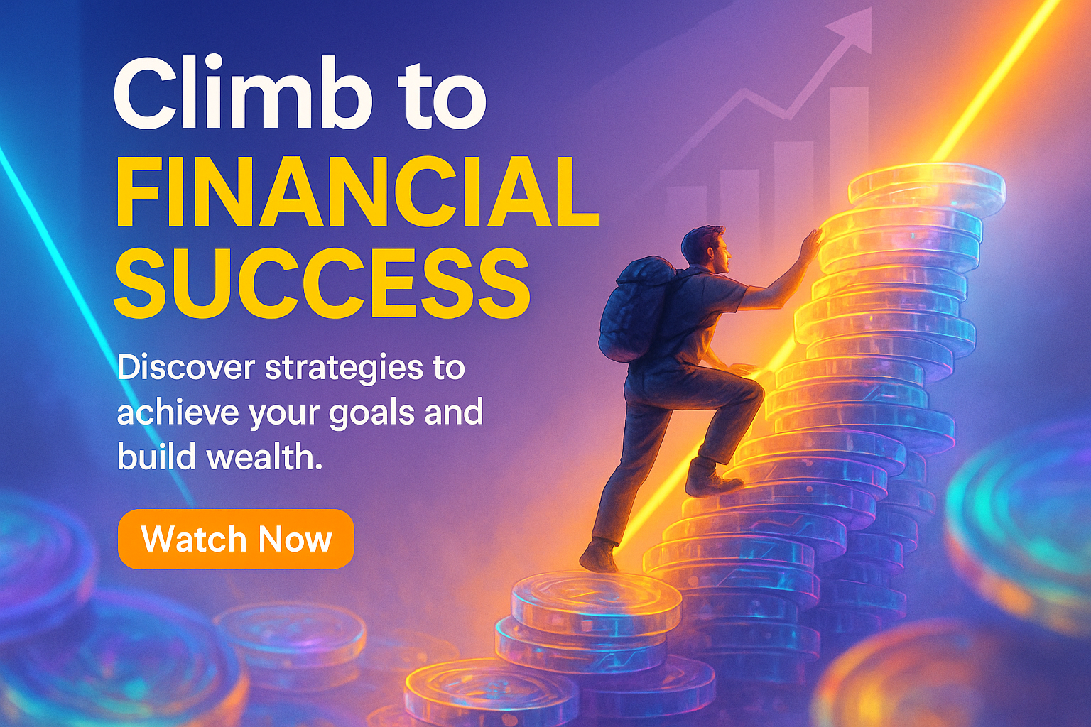 /Collection: /by davooda/Type: PNG/Inspirational digital artwork depicting a person climbing steps made of coins, symbolizing the journey to financial success. Ideal for financial education campaigns.