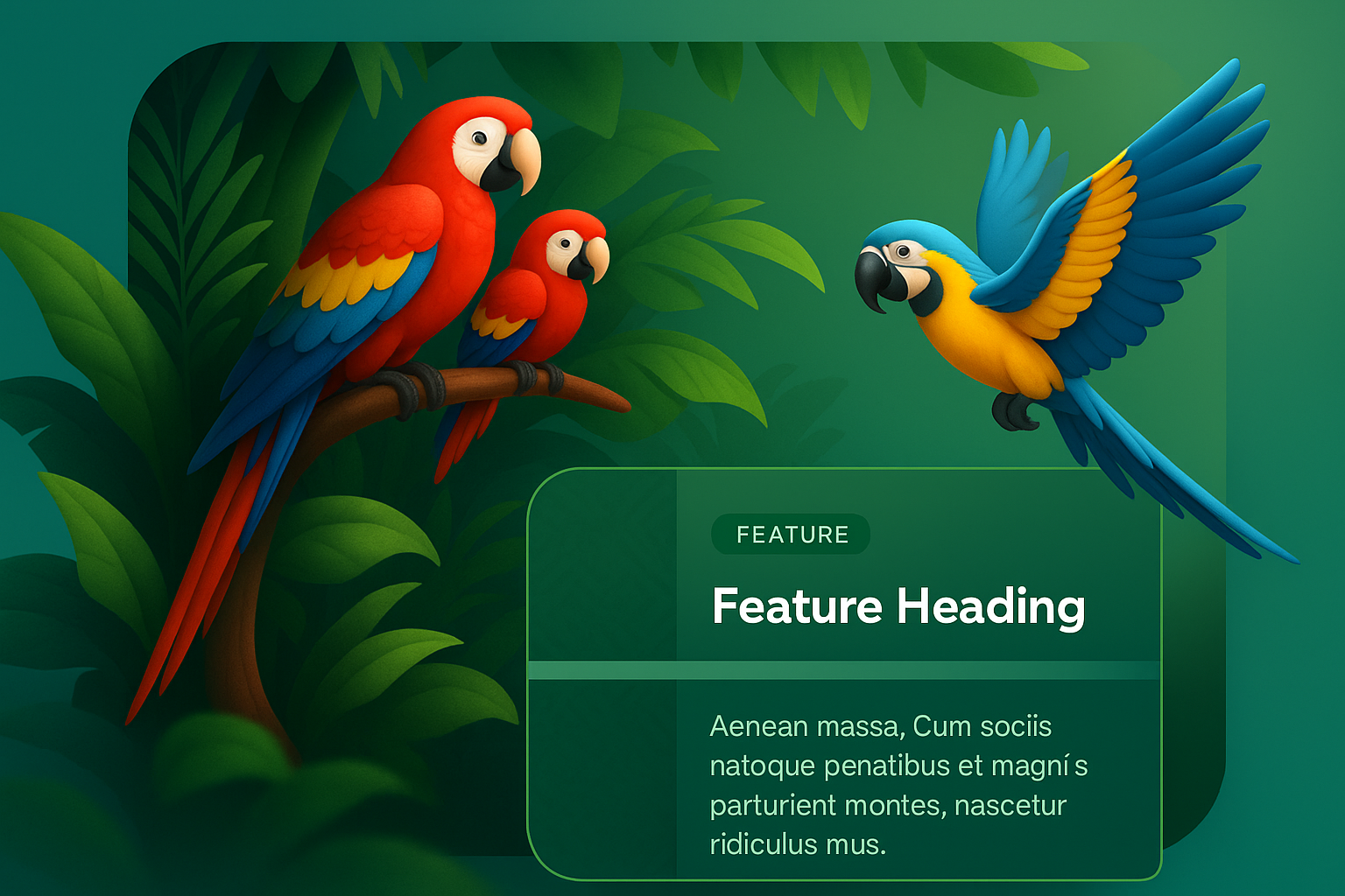 A vivid illustration of a tropical rainforest featuring colorful parrots perched on branches. The design includes a layered composition with a gradient background and integrated feature block.