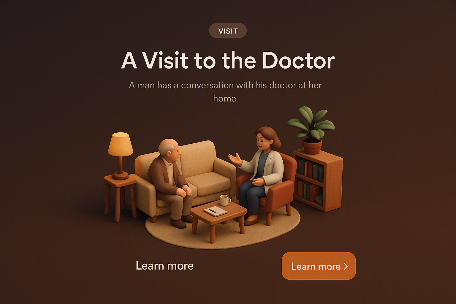 A cozy 3D scene depicting a man conversing with a doctor at home. The setting features a sofa, coffee table, lamp, and bookshelf in a dark gradient background.