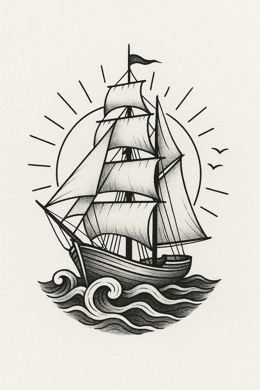 This image features a detailed black and white ink illustration of a classic sailing ship amidst stylized waves, ideal for nautical art themes.