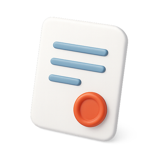 A modern 3D representation of a document featuring horizontal lines and a circular seal, suitable for digital applications and branding. Ideal for use in websites or apps.