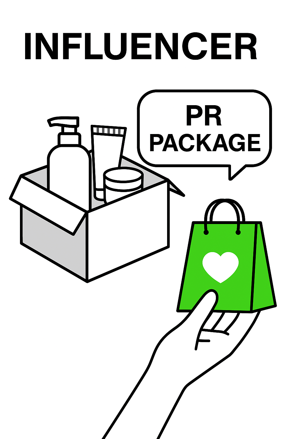 /Collection: /by davooda/Type: PNG/Graphic representation of an influencer's PR package featuring a hand holding a branded shopping bag and an open box of beauty products, ideal for social media marketing.