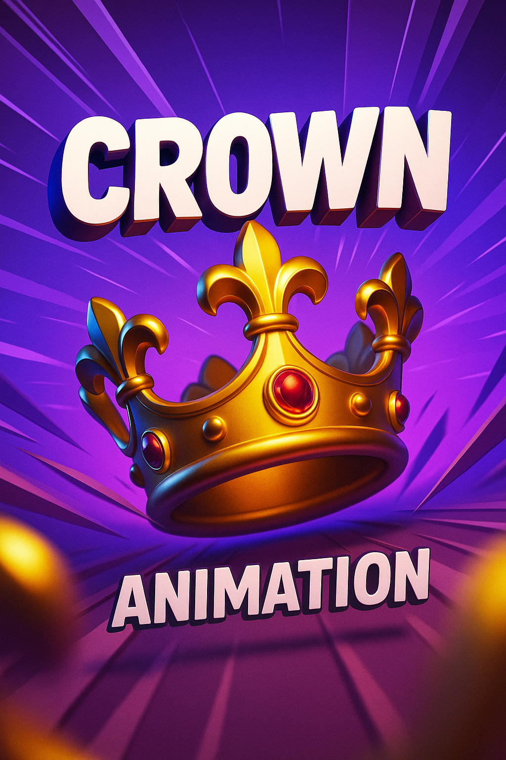 This vibrant image features a 3D crown against a dynamic gradient background, with bold typography emphasizing 'CROWN' and 'ANIMATION'. The composition is engaging and visually striking.
