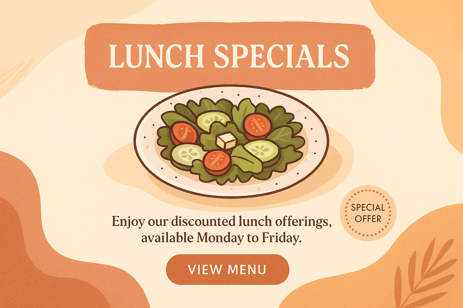 A visually appealing lunch specials menu in boho style. Features a colorful salad on a plate with a clean backdrop and engaging typography.