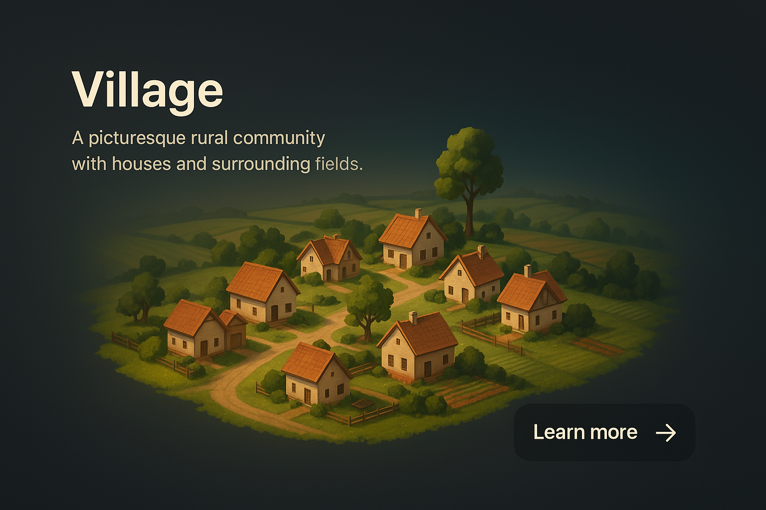 A serene 3D depiction of a village featuring quaint houses and lush fields, set against a dark gradient background. The layout captures a bird's-eye view of the rural community, showcasing its picturesque charm.