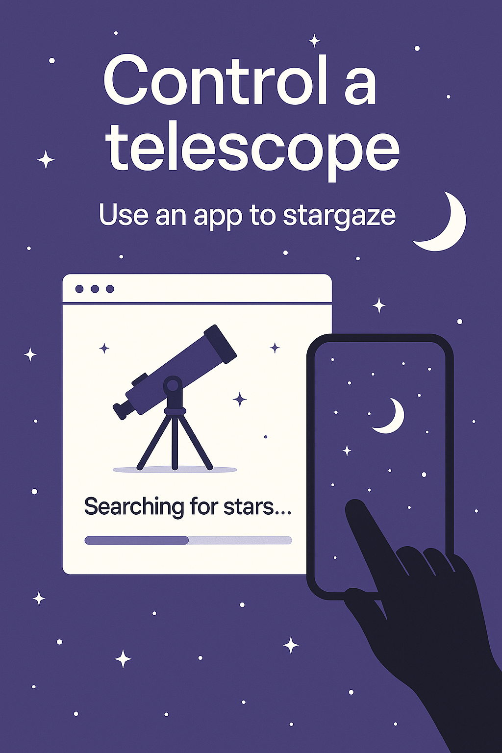 /Collection: /by davooda/Type: PNG/A modern graphic illustrating the concept of controlling a telescope via a mobile app. The design features a nighttime sky with stars, emphasizing technology and exploration, ideal for educational or promotional materials.