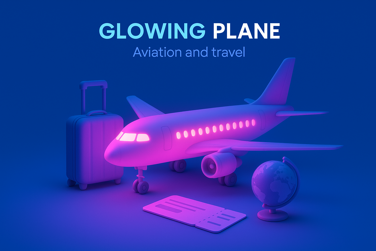 A vibrant scene featuring a glowing airplane surrounded by a suitcase and a globe. The neon pink light emanates from the plane, creating a captivating atmosphere with cool blue and purple tones.