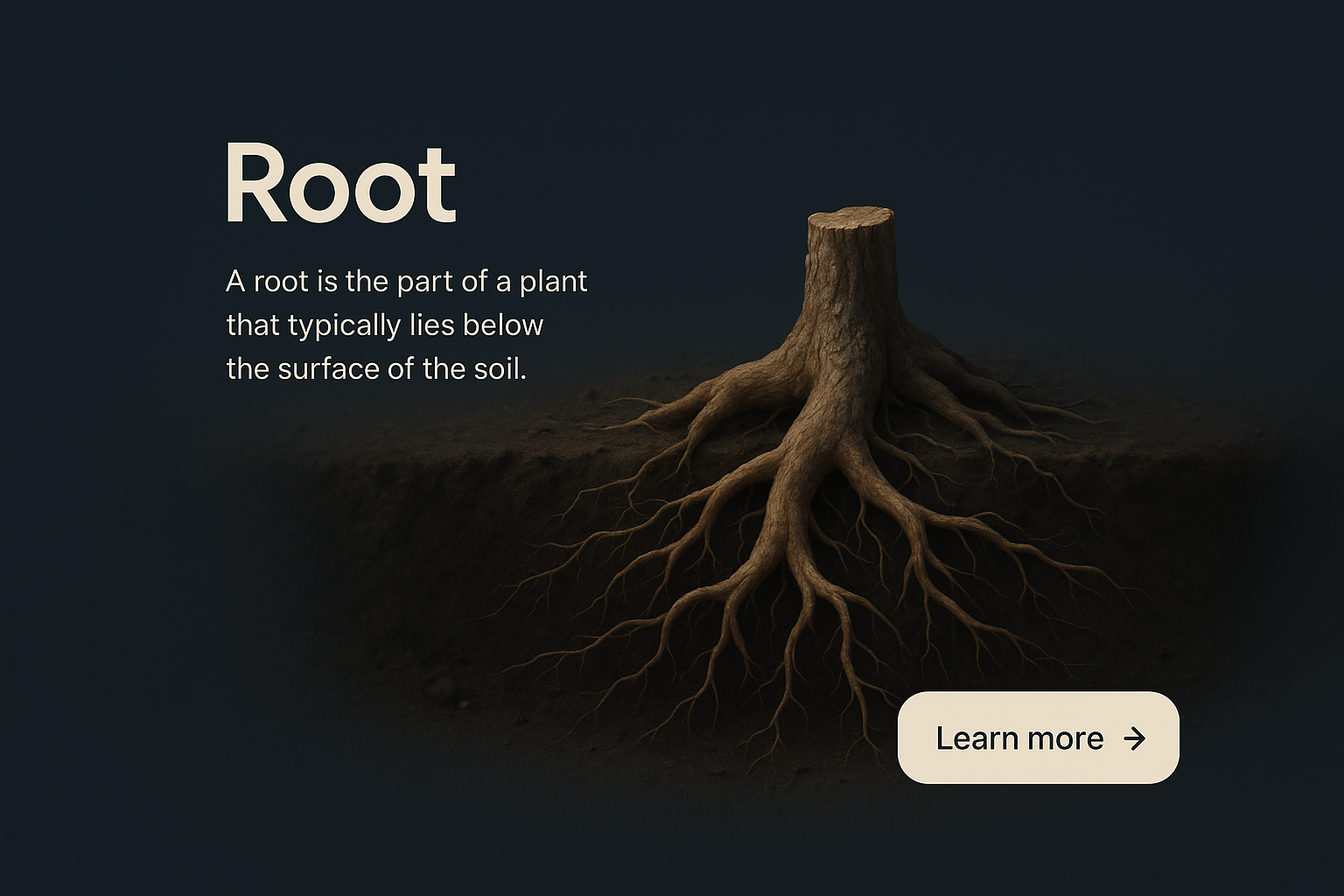/Collection: /by davooda/Type: PNG/A visually striking 3D representation of a plant's root system, set against a dark gradient background. The scene includes a small action button and concise text, enhancing viewer engagement.