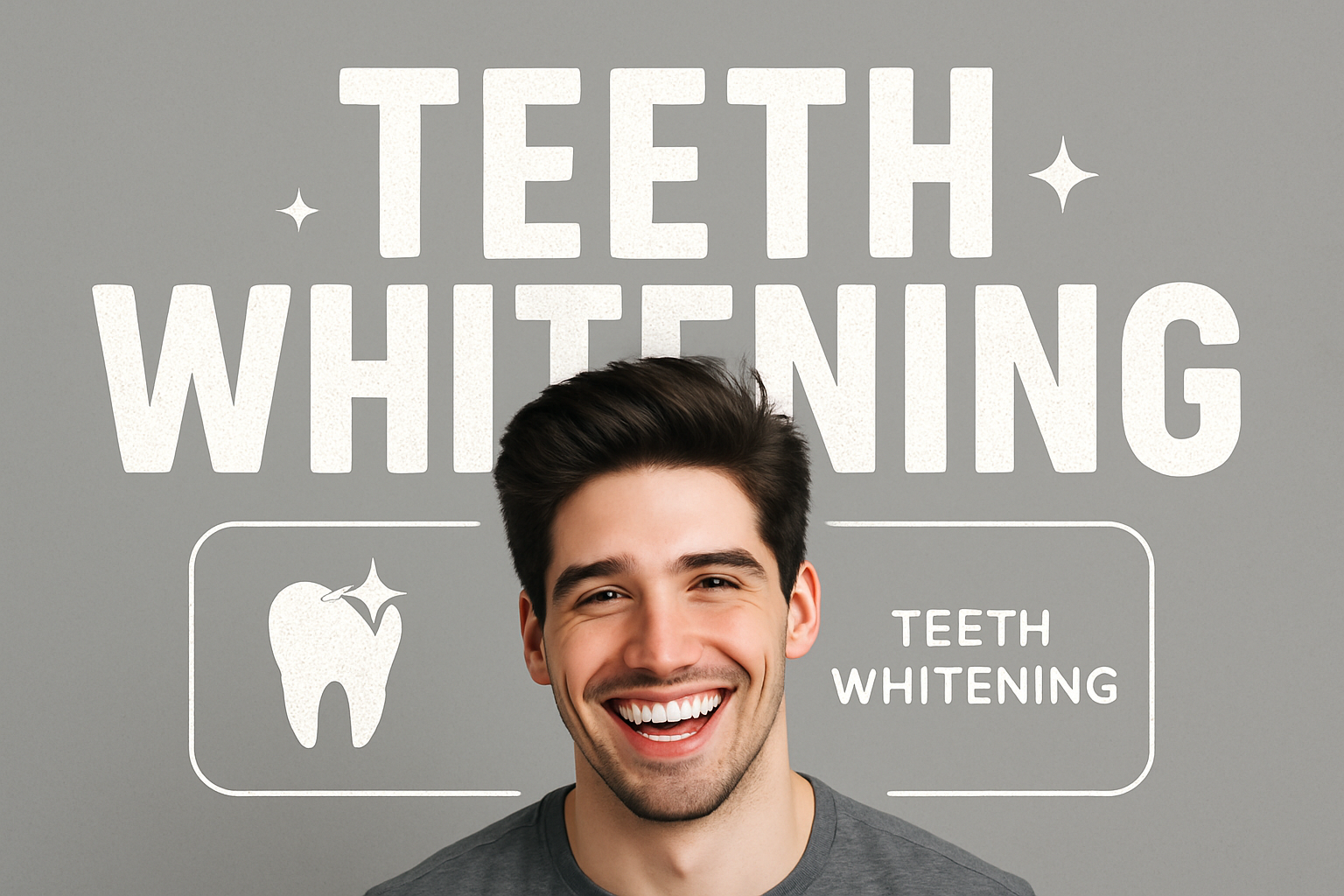Promotional graphic for teeth whitening services featuring a smiling individual and bold typography. Ideal for dental clinics and cosmetic advertising.
