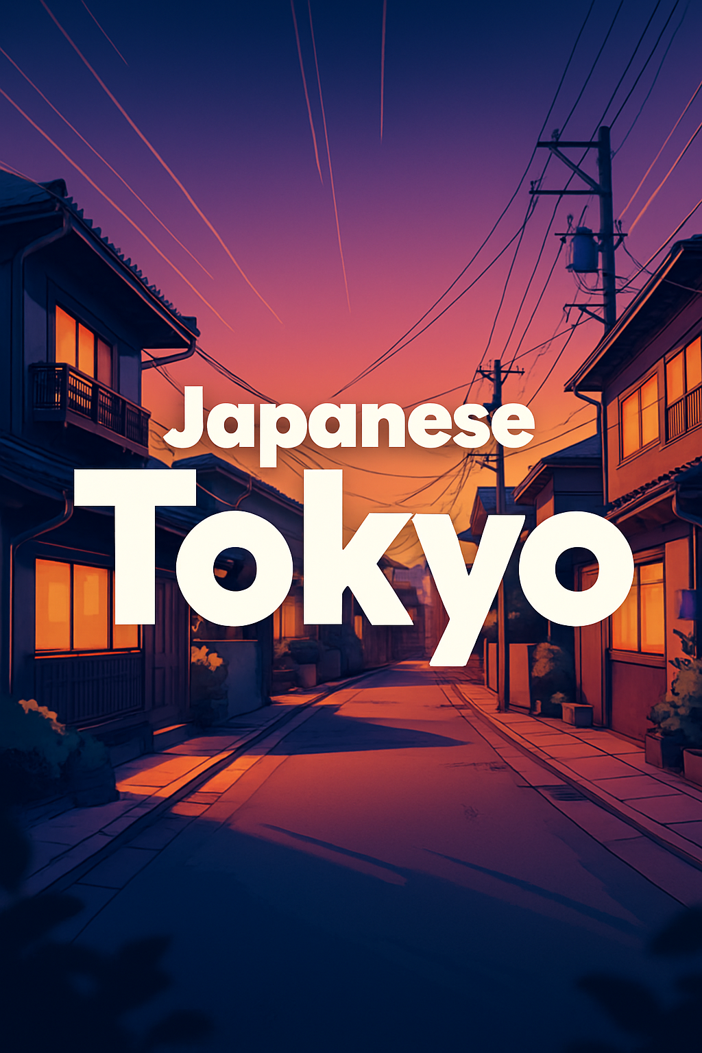 A vibrant evening scene of Tokyo, featuring cozy houses and dynamic lines in a captivating anime art style, with a gradient sunset background.