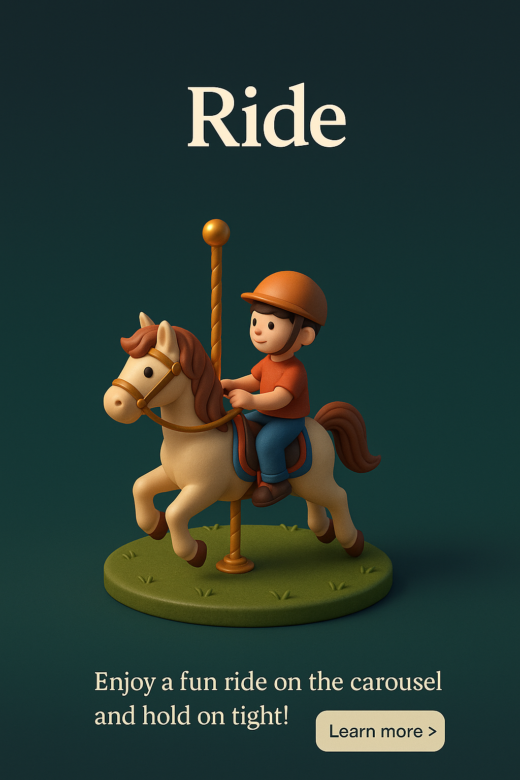 /Collection: /by davooda/Type: PNG/A captivating 3D scene featuring a child on a carousel horse, against a dark gradient background. The image showcases a playful and vibrant atmosphere with readable text.