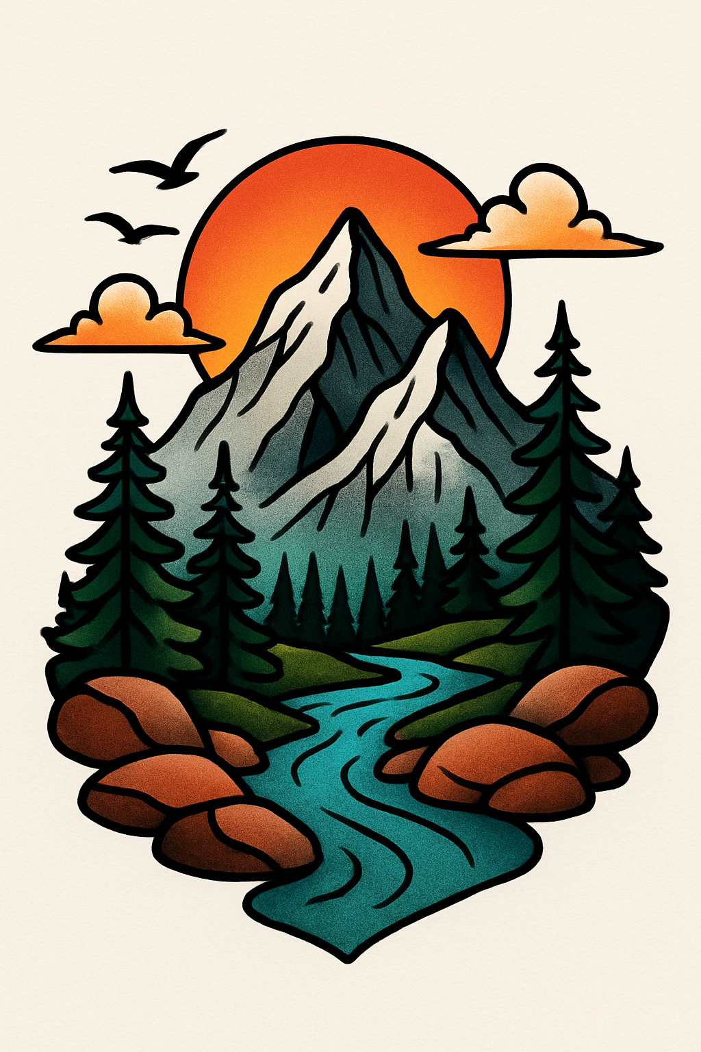/Collection: /by davooda/Type: PNG/Vibrant and colorful illustration of a mountain landscape featuring a river, pine trees, and a sunset. This design is perfect for outdoor enthusiasts and nature-themed projects.