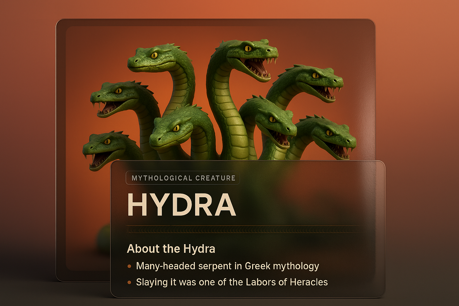 A 3D illustration of the Hydra, a mythological creature with multiple serpent heads, set against a gradient background. Featuring an integrated information panel with a sleek design.