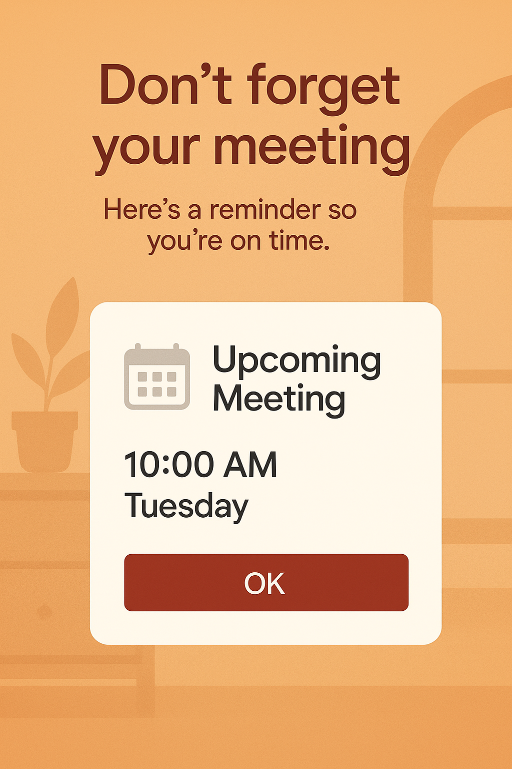 Digital reminder graphic featuring a scheduled meeting notification with a warm color palette and clean design, ideal for productivity apps or calendar reminders.