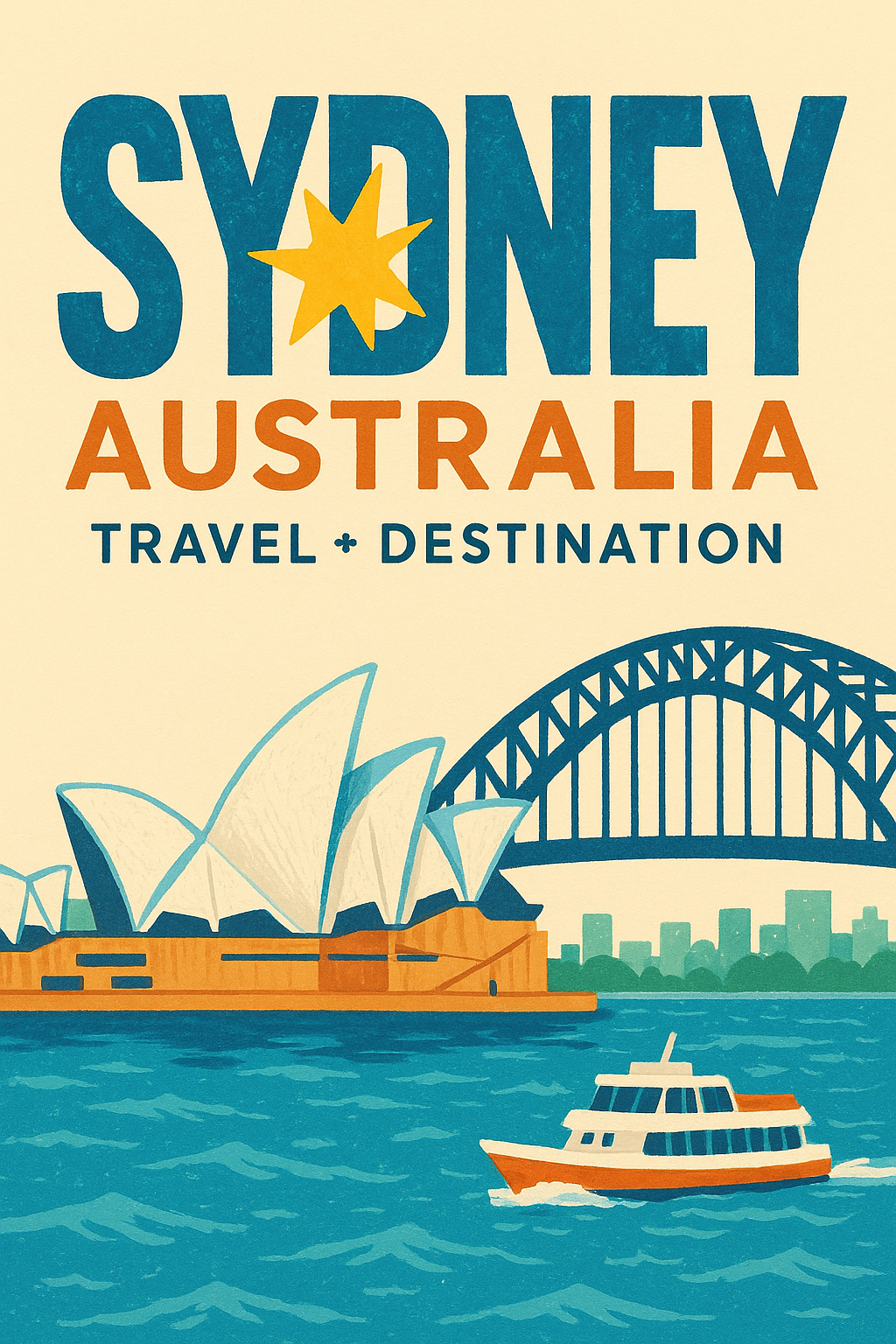 Stylized Travel Poster Featuring Sydney and Iconic Landmarks