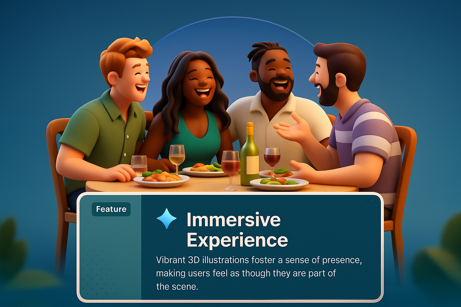 /Collection: /by davooda/Type: PNG/A lively group of friends laughing and sharing a meal at an outdoor restaurant during summer. The scene is vibrant and warm, capturing the joy of togetherness.