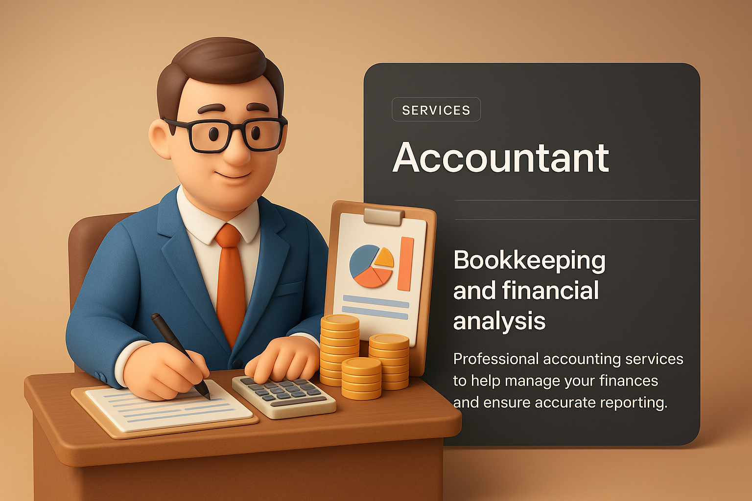 A 3D illustration featuring an accountant at a desk with coins, a calculator, and a notepad, alongside a dark panel highlighting services related to bookkeeping and financial analysis.