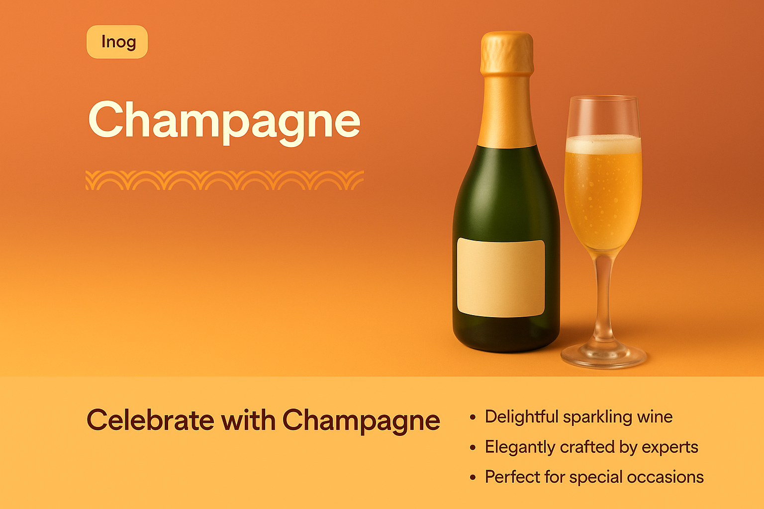 /Collection: /by davooda/Type: PNG/A visually appealing 3D illustration of a champagne bottle and glass against a warm gradient background. Features bullet points highlighting its delightful qualities.