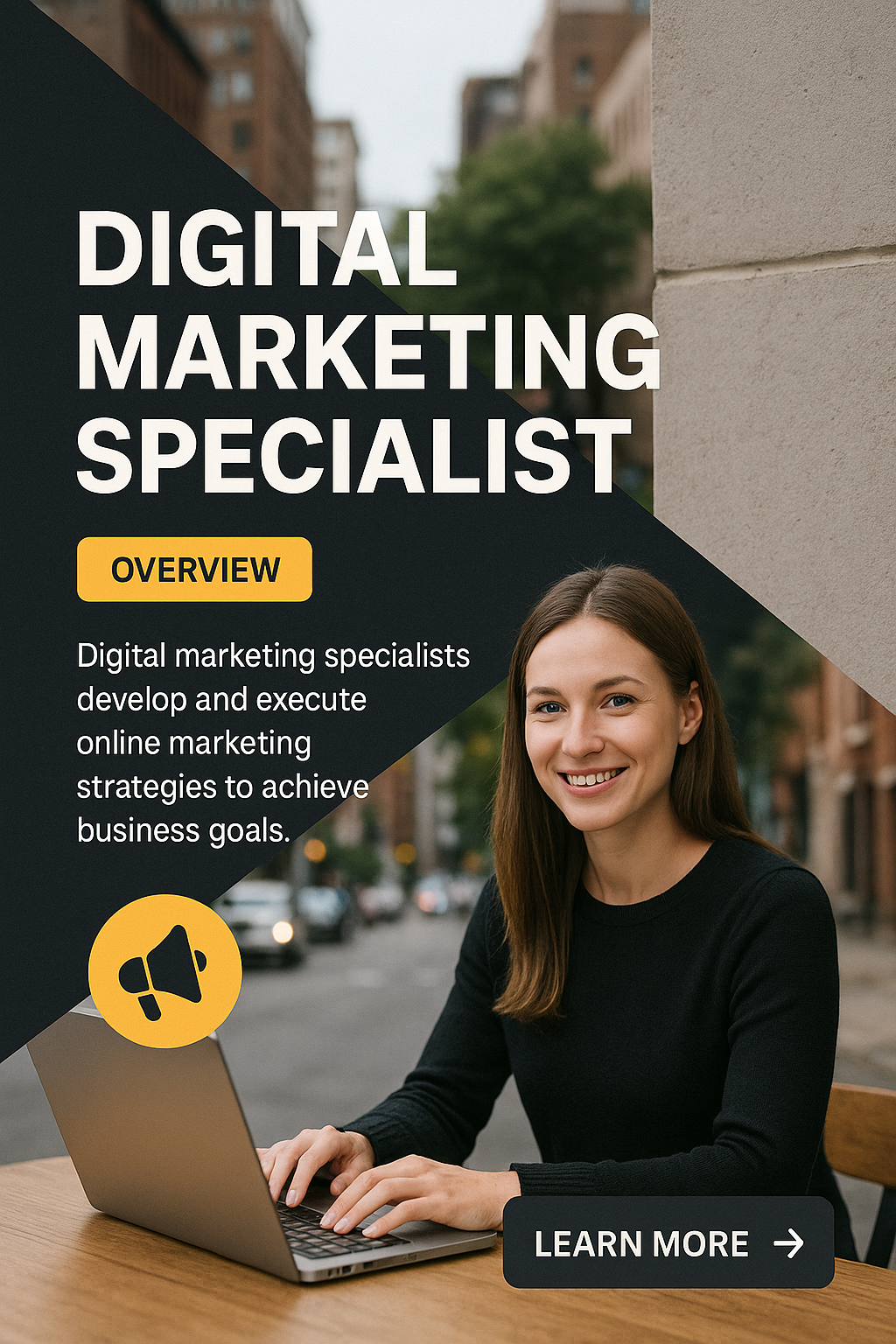 /Collection: /by davooda/Type: PNG/A professional digital marketing specialist working on a laptop in an urban setting. The design features a clear hierarchy with an engaging aesthetic, including a prominent title and action button.