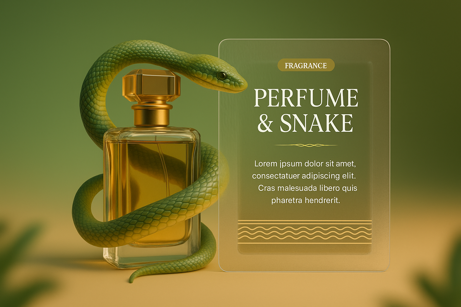 A 3D illustration featuring a stylized perfume bottle entwined with a green snake. The background blends gradient colors, enhancing the luxurious feel of the product display.