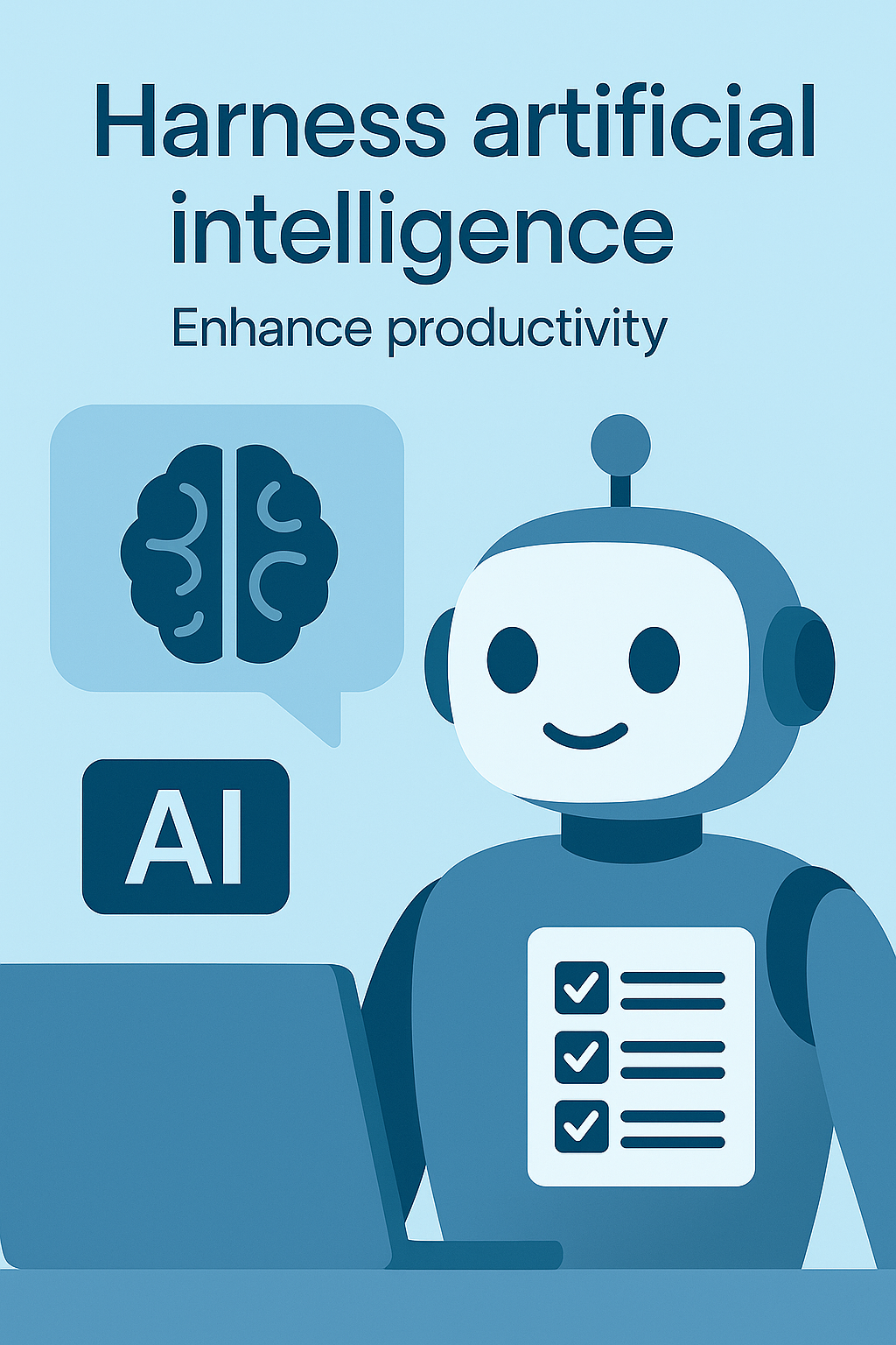 Graphic representation of a robot symbolizing artificial intelligence aimed at enhancing productivity, featuring a clean, modern design ideal for tech-related content.