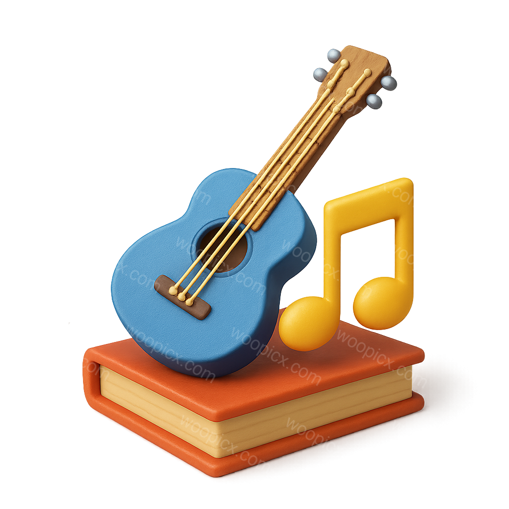 This vibrant 3D icon features a blue guitar and a yellow musical note, placed on an orange book. The isometric design creates a playful, artistic feel.