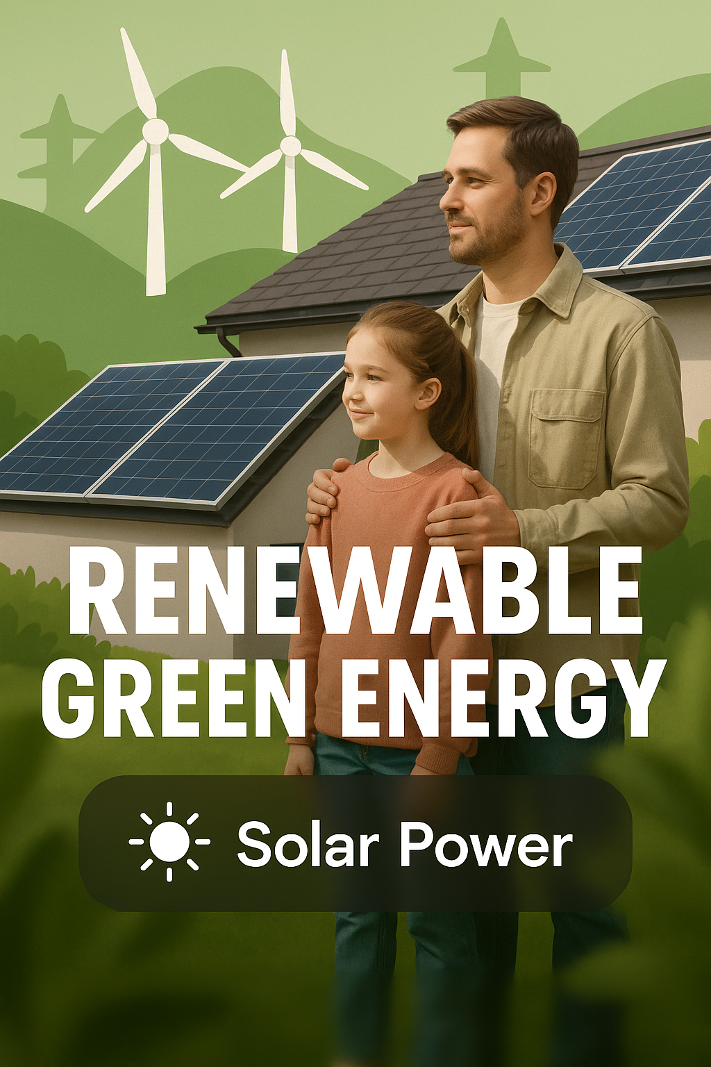 /Collection: /by davooda/Type: PNG/A visually engaging promotional image highlighting renewable green energy featuring solar panels and wind turbines. Ideal for sustainability campaigns or educational content.