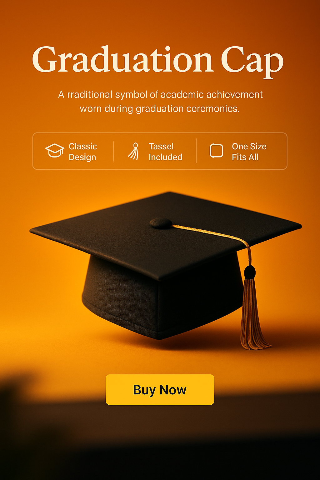 This image showcases a graduation cap against a warm orange background, designed for promotional use. It features a classic design and highlights key selling points.