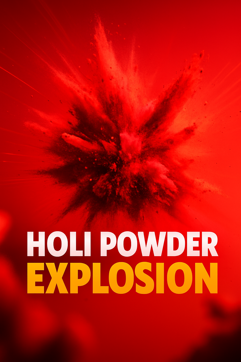 /Collection: /by davooda/Type: PNG/An intense explosion of bright red Holi powder creates a dynamic and energetic visual. The design features layered elements with a smooth gradient background and bold typography.