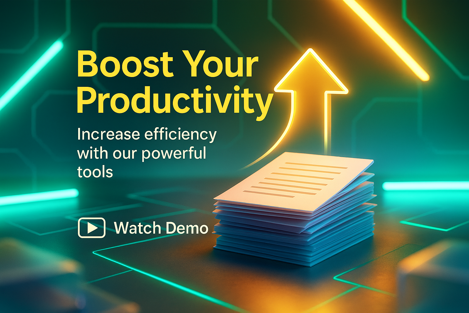 /Collection: /by davooda/Type: PNG/Vibrant promotional graphic showcasing productivity tools with a glowing arrow and stacked documents. Ideal for digital marketing campaigns aimed at professionals.