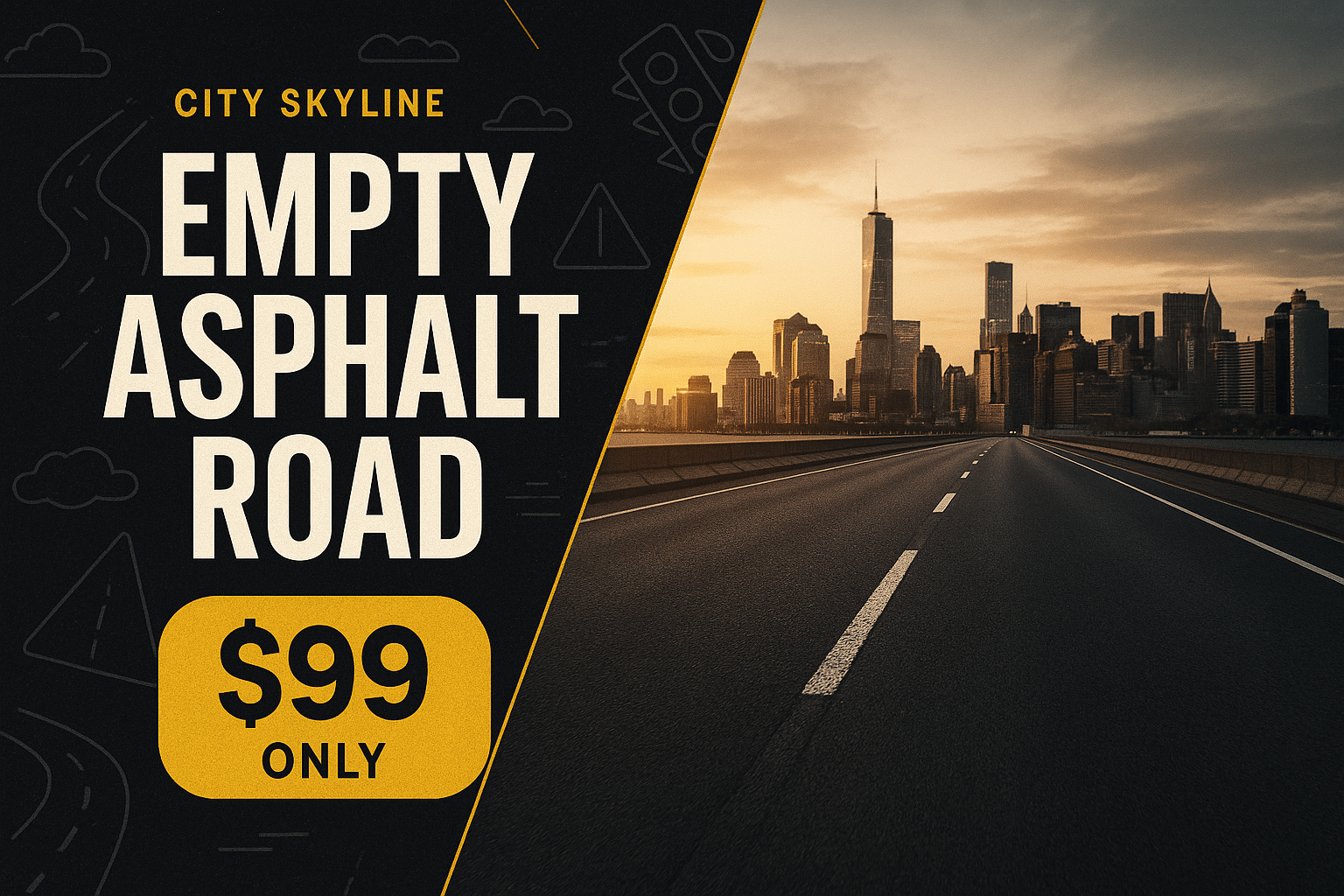 /Collection: /by davooda/Type: PNG/A modern advertisement featuring an empty asphalt road leading to a city skyline. The design incorporates bold typography and a dynamic layout, emphasizing the price and product.