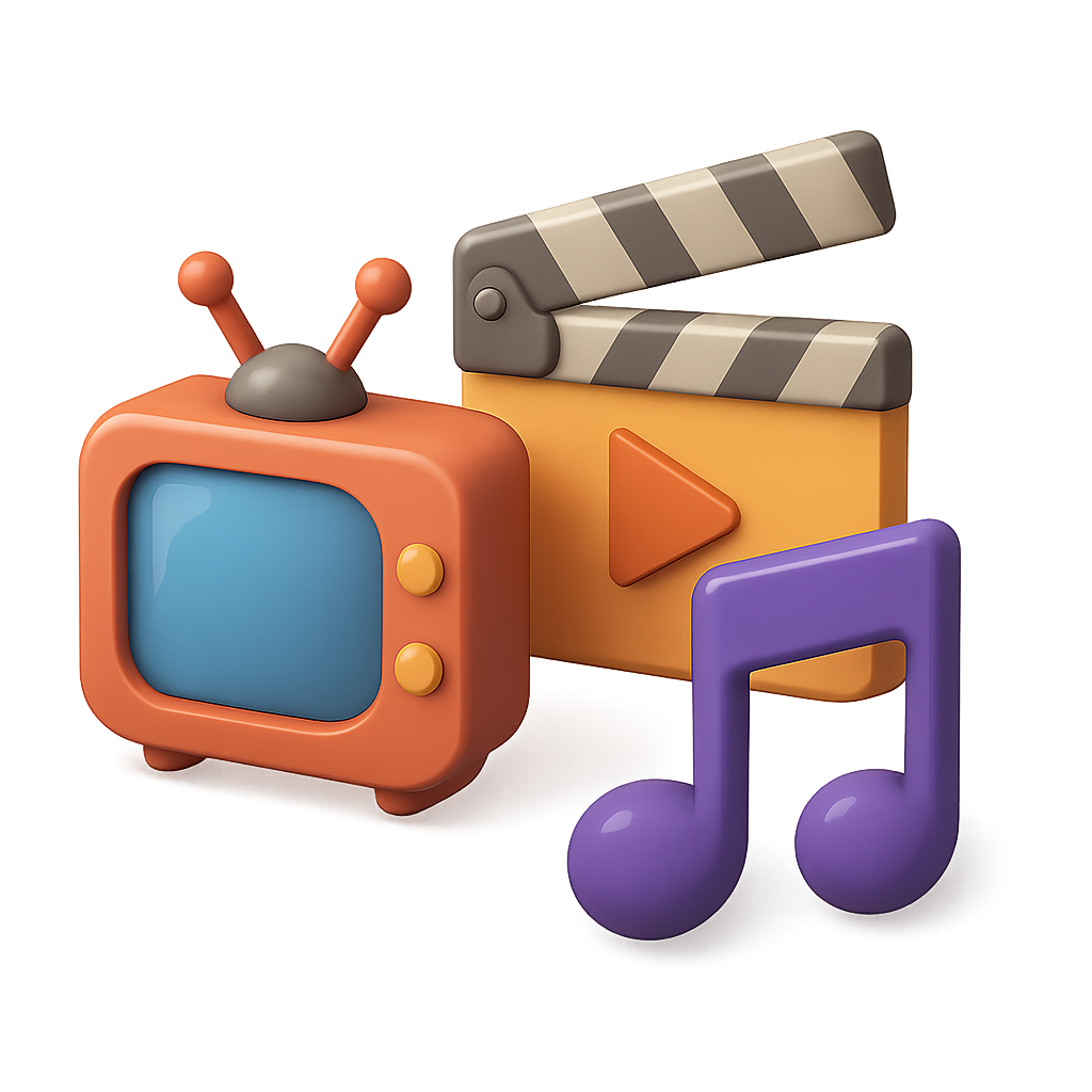 /Collection: /by davooda/Type: PNG/A vibrant 3D illustration featuring a retro TV, film clapperboard, play button, and a music note. The design showcases a playful, volumetric style with a transparent background.