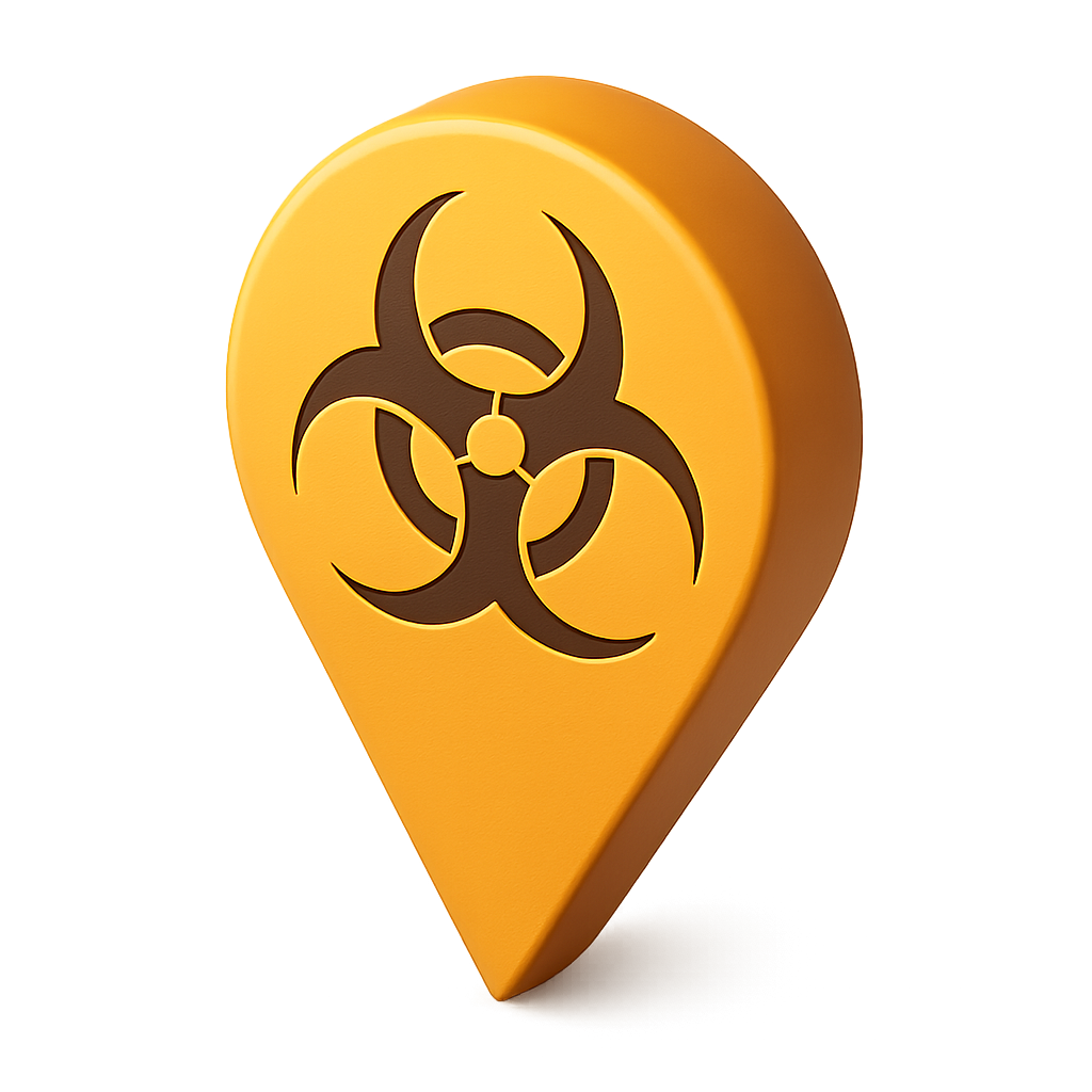 A stylized 3D biohazard location marker featuring a yellow teardrop shape with a black biohazard symbol. The design emphasizes depth and a glossy finish against a soft gradient background.