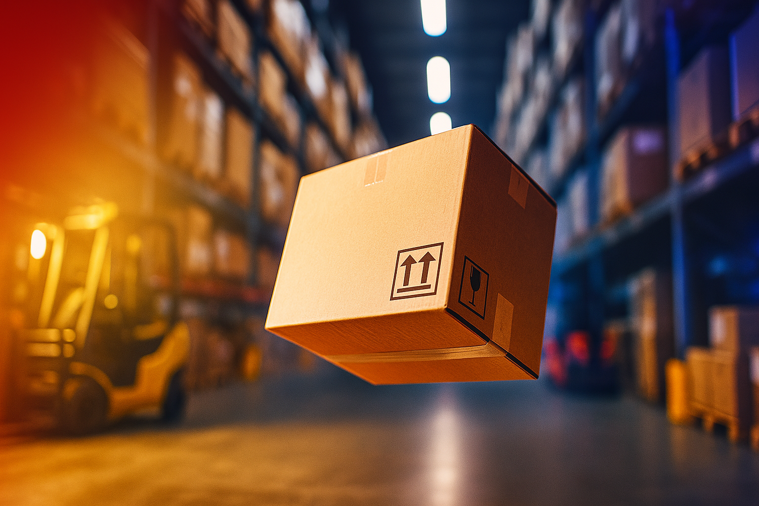 /Collection: /by davooda/Type: PNG/A vibrant retail warehouse scene showing floating cartons amidst shelves filled with goods. Forklifts and a blurred logistics background enhance the dynamic atmosphere.