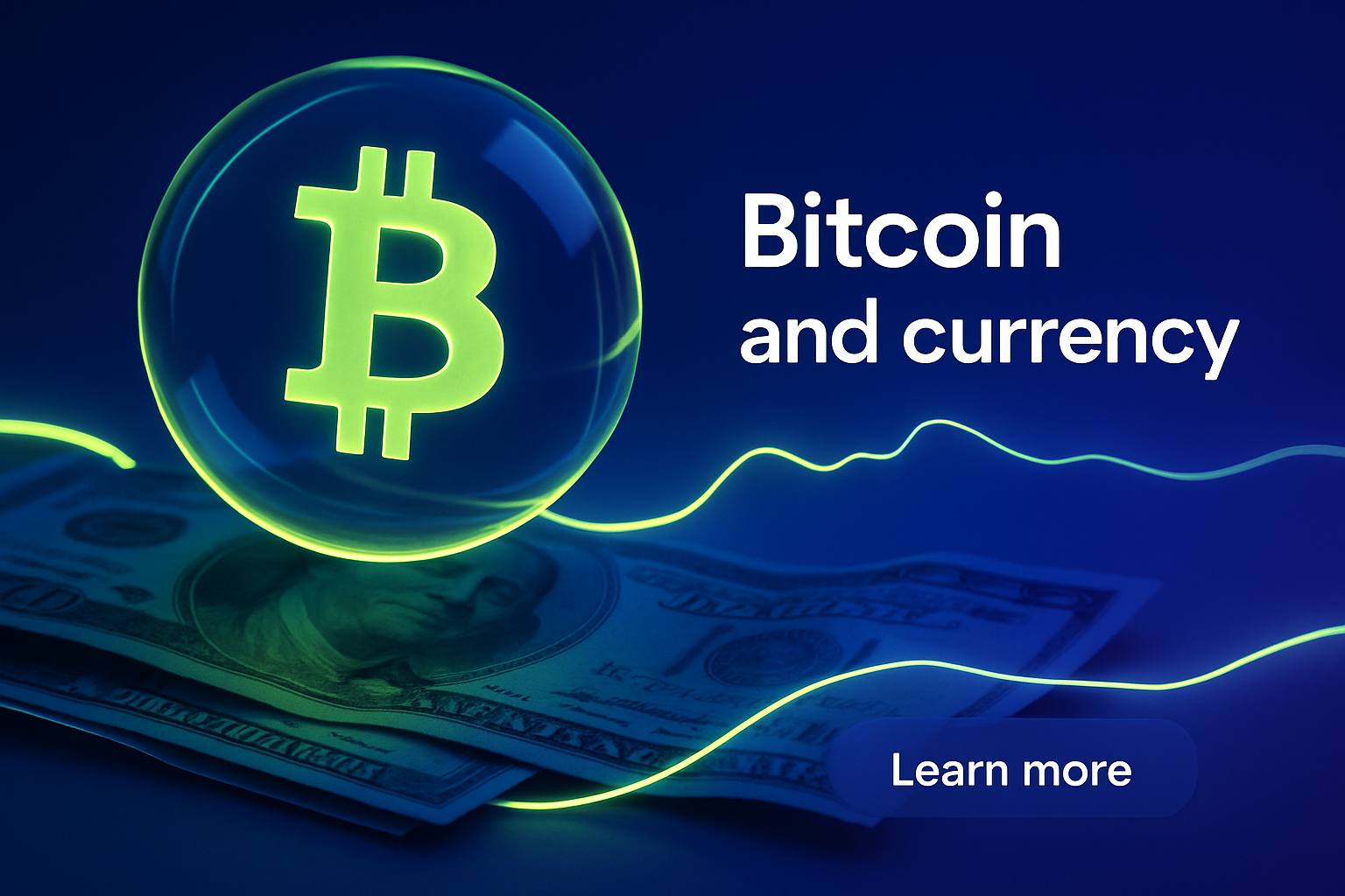 /Collection: /by davooda/Type: PNG/A vibrant 3D illustration featuring a glowing Bitcoin symbol and currency notes. The scene is illuminated by neon lines, creating a dynamic atmosphere against a solid blue background.