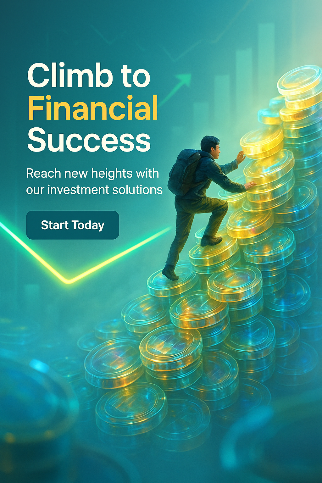 Dynamic digital illustration depicting a person climbing a staircase made of coins, symbolizing financial growth and investment success. Ideal for marketing financial services.