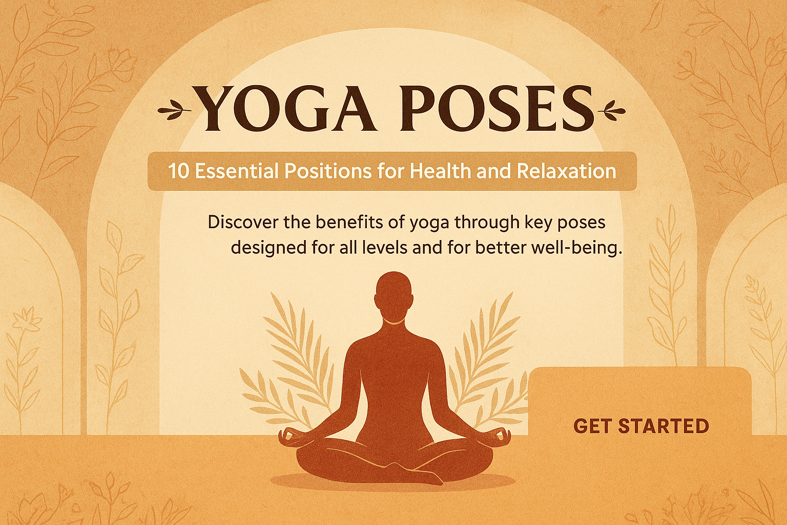 /Collection: /by davooda/Type: PNG/An infographic showcasing 10 essential yoga poses for health and relaxation, set in a boho style. Features a serene figure in meditation surrounded by nature-inspired design elements.