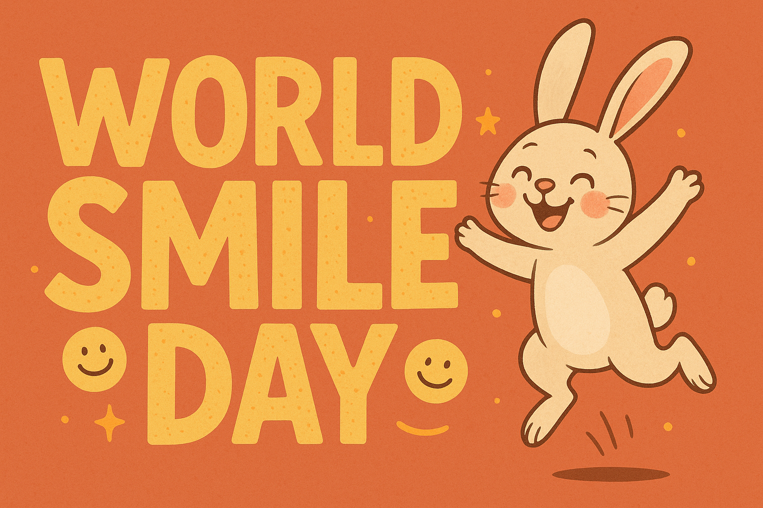 A cheerful and playful graphic celebrating World Smile Day, featuring a cute rabbit and vibrant colors. Ideal for social media posts or event promotions.