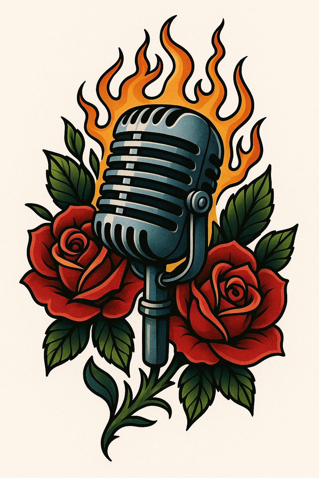 /Collection: /by davooda/Type: PNG/A bold tattoo-style illustration featuring a vintage microphone surrounded by vibrant red roses and stylized flames. Ideal for music-themed artwork, merchandise, or personal tattoo inspiration.