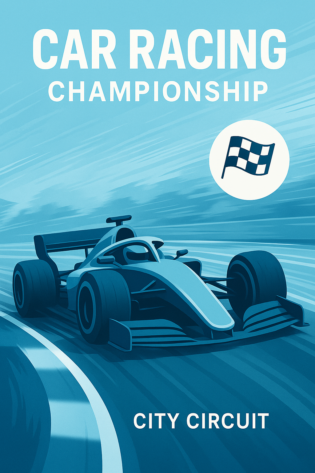 Vibrant graphic poster showcasing a stylized racing car and checkered flag, ideal for promoting a car racing championship. The design features a modern, minimalist aesthetic in blue tones.